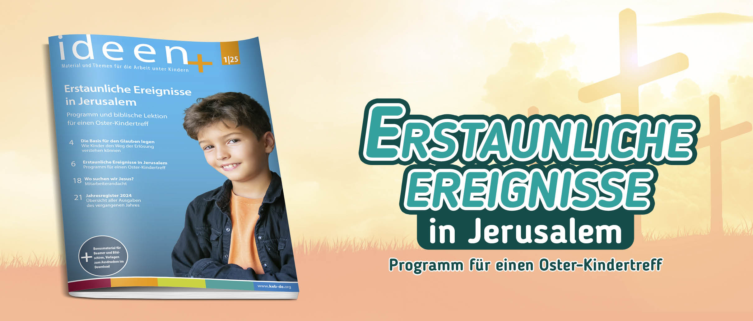 Programm für einen Oster-KindertreffWas geschah wirklich an Ostern? Und warum ist es die wichtigste Botschaft, die Kinder hören können?Die neue Ausgabe von Ideenplus hilft dabei, die biblische Ostergeschichte lebendig und verständlich zu vermitteln. Die tiefgehende biblische Lektion „Erstaunliche Ereignisse in Jerusalem“ wird durch ansprechende Bilder unterstützt und lässt Kinder staunen. Ein durchdachtes Programm für einen Oster-Kindertreff bietet umfangreiches Material für eine abwechslungsreiche Kinderstunde – ideal für Kindertreffs, Sonntagsschulen und Kindergottesdienste. Der Bibelvers zum Lernen aus 1. Petrus 2,24 hilft Kindern zu verstehen, was Jesus für sie getan hat. Der Sachartikel „Die Basis für den Glauben legen“ gibt wertvolle Impulse, wie Kinder den Weg zur Erlösung verstehen können. Zudem bietet die Mitarbeiterandacht „Wo suchen wir Jesus?“ geistliche Ermutigung für alle, die mit Kindern arbeiten. Mit zusätzlichen Spielen, Bastelideen und Liedvorschlägen wird diese Ausgabe zu einer wertvollen Hilfe für Kinderstunden, Ostertreffs und missionarische Arbeit. Wie immer gibt es Bonusmaterial für Beamer oder Bildschirm, inklusive praktischer Vorlagen zum Ausdrucken. Hinweis zum Download: Die PDF-Datei des Heftes steht Ihnen in Ihrem Kundenbereich zur Verfügung. Den Download-Code für das begleitende Arbeitsmaterial finden Sie im Heft. Besuchen Sie www.keb-de.org/download und geben Sie dort den Code ein. Zum Öffnen und Ausdrucken benötigen Sie lediglich einen aktuellen PDF-Reader.Beachten Sie auch unseren Jahresplan