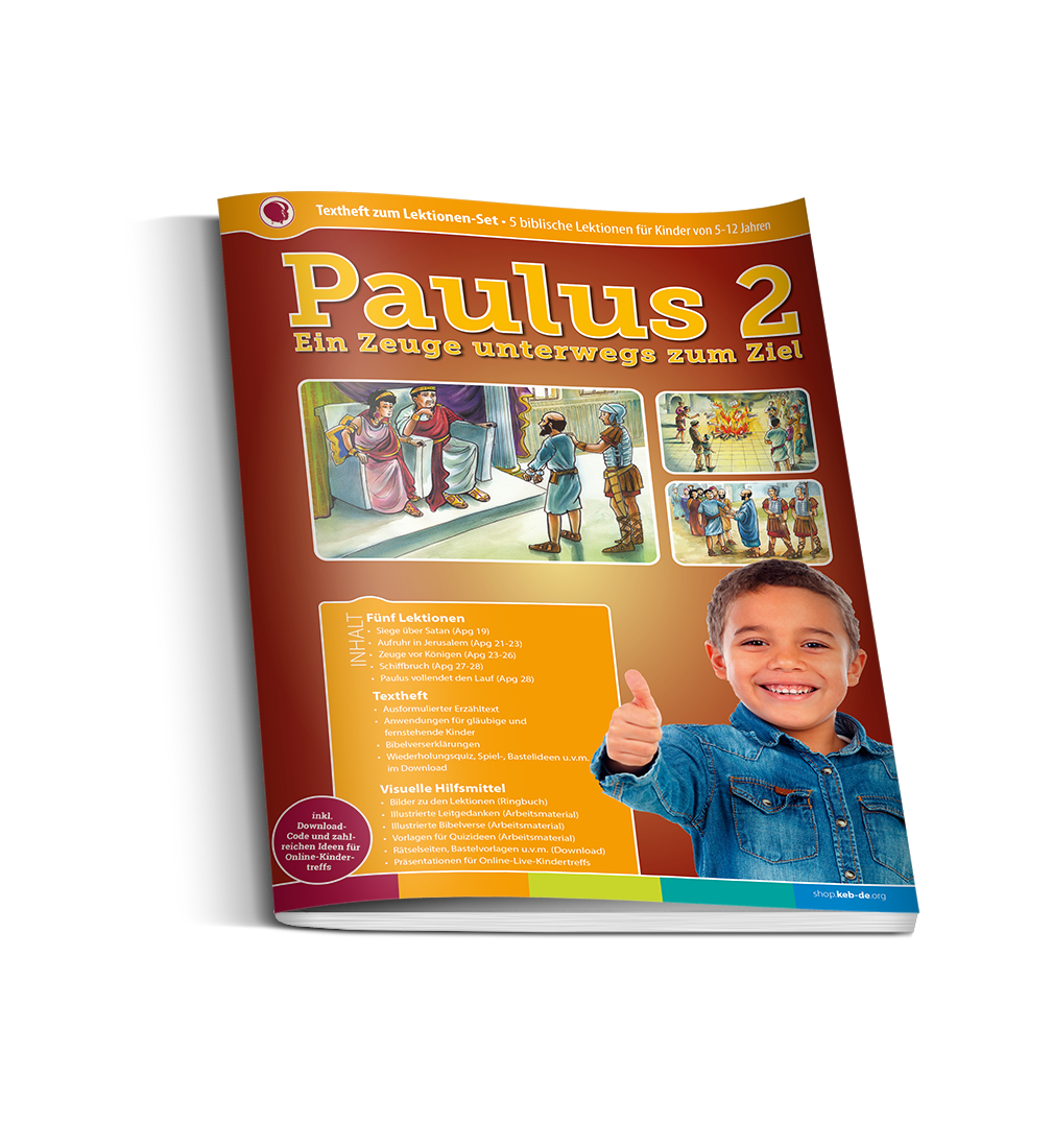 Durch die fünf Lektionen – Siege über Satan (Apg 19) · Aufruhr in Jerusalem (Apg 21-23) · Zeuge vor Königen (Apg 23-26) · Schiffbruch (Apg 27-28) · Paulus vollendet den Lauf (Apg 28) – werden wir die Gelegenheit haben, den Kindern wichtige Wahrheiten über Gott sowie den Beginn, den Lauf und das Ziel als Christen zu vermitteln. Das Hauptaugenmerk liegt auf Gottes Versprechen, seiner Treue, der Mission und der Herausforderung, trotz Schwierigkeiten und entgegen aller Widerstände Christus zu bezeugen.
